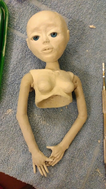 Wykonałam lalkę BJD z masy gipsowej. Lalka jest ruchoma - ramiona, głowa, talia, biodra i kolana połączone są, nazwijmy to "stawami". Przybiera pozycje i blokuje się, więc można ją posadzić na półce lub w dowolnym miejscu. Malowanie farbami akrylowymi, zabezpieczone werniksem - sprawdzone :-) przybrudzenia schodzą wilgotną szmatką. Plastikowe oczy, włosy białe i rzęsy czarne - syntetyczne - reszta od podstaw wyrzeźbiona. Lalka jest w tej chwili ubierana, oczywiście pokażę efekt pracy, ale już opisu Wam oszczędzę :-) Wzrost - 34cm. Lalka będzie w sprzedaży, jak tylko ją ubiorę. Życzę miłego oglądania :-)